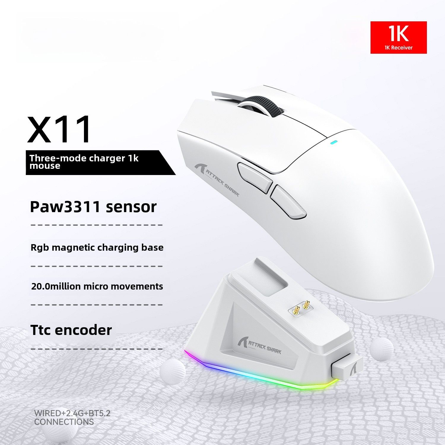Souris de jeu sans fil ATTACK SHARK X11 avec station de chargement capteur de jeu PixArt PAW3311, BT/2.4G sans fil/filaire