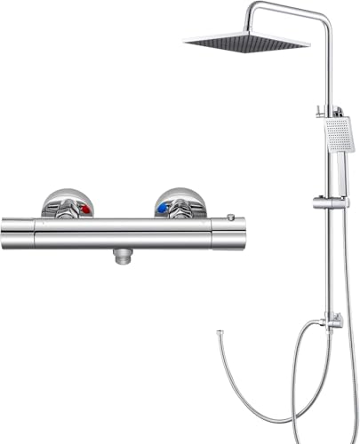 Auralum Mitigeur de douche avec thermostat, système de douche avec douche à effet pluie carrée (25 x 25 cm), douchette, thermostat et barre de douche réglable en hauteur