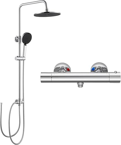 Auralum mitigeur de douche avec thermostat, système de douche avec douche à effet pluie ronde (Ø 25 cm), douchette, thermostat et barre de douche réglable en hauteur