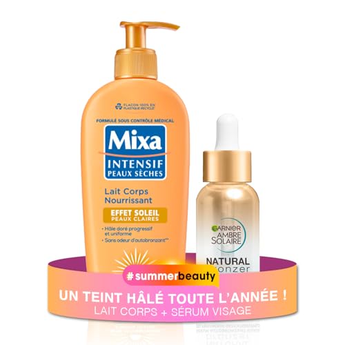 Duo Teint Hâlé Assuré – Mixa – Garnier – Lait Corps Effet Soleil + Sérum Visage Autobronzant – Hâle Naturel Progressif