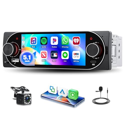 Hikity FM AM RDS 1 Din Autoradio Weireless Carplay Android Auto, Ecran Tactile 5,1 Pouces Bluetooth Poste Radio Voiture avec FM, EQ Mirror Link, AUX/TF/USB, Caméra de Recul