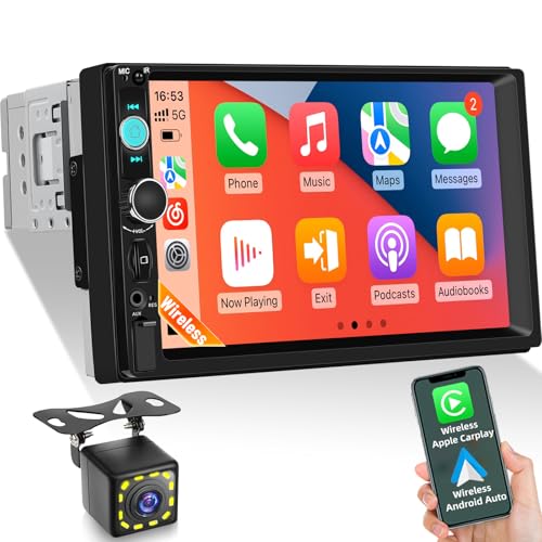 Autoradio 1 Din avec écran Tactile IPS 7 Pouces, Apple CarPlay et Android Auto sans Fil et Filaire, Bluetooth, FM, Youtube, Sortie vidéo, Commande au Volant, caméra de recul Incluse
