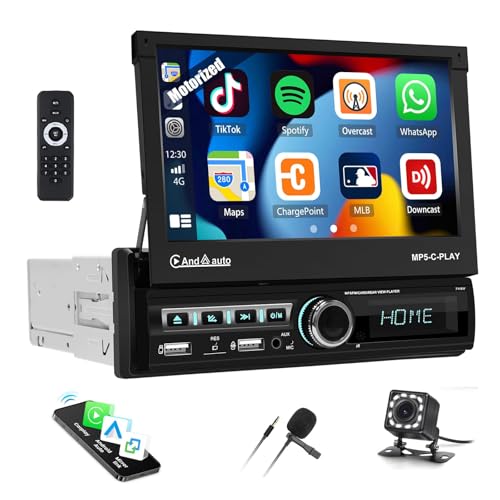 1 Din Autoradio Carplay Android Auto sans Fil, Écran Tactile Rétractable 7 Pouces Radio pour Voiture Stéréo avec Récepteur Bluetooth FM Caméra de Recul Microphone
