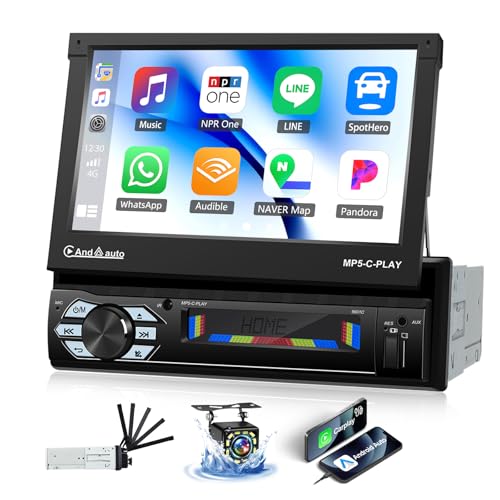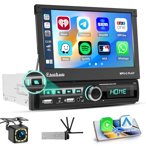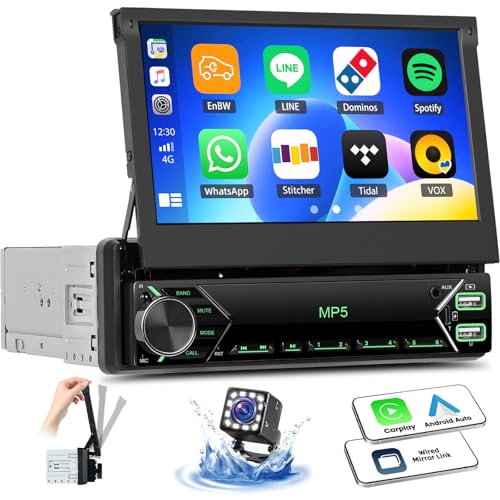 Mise à Jour sans Fil Carplay Autoradio 1 Din Bluetooth avec Android Auto 7'' Flip Out Écran Tactile stéréo Retractable Lecteur Motorisé Radio Voiture 1 Din FM, SWC, AUX-in+ Caméra de recul