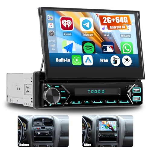 1 Din Autoradio Android 13 avec CarPlay sans Fil Android Auto Écran Tactile Rétractable 7 Pouces GPS Navi Mirror Link Bluetooth Radio FM/RDS Entrées USB/AUX, SWC+ Caméra de recul