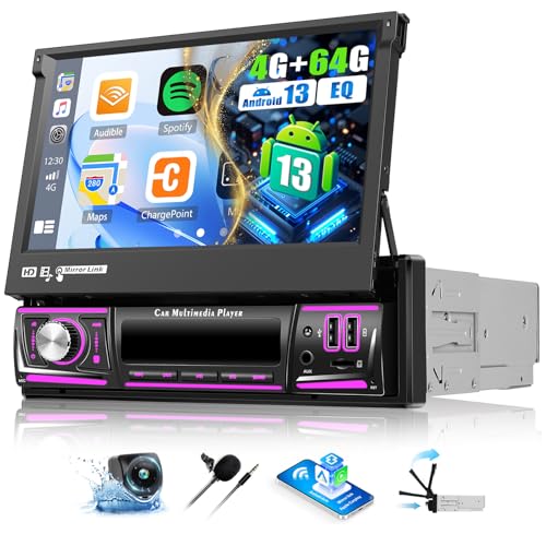 4+64G Android 13 Autoradio 1 DIN- Écran IPS rétractable 7" avec CarPlay sans Fil et Android Auto - Autoradio 1DIN avec EQ BT GPS WiFi FM/RDS Mirrorlink SWC Caméra de recul
