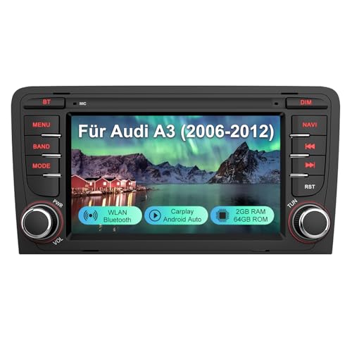 Autoradio 2 din pour Audi A3 8P 8P1 S3 8P avec ecran Carplay san Fil Auto Radio Android Auto,Compatible Commande au Volant,DSP,EQ,Subwoofer,Radio FM AM RDS,Bluetooth,USB,Écran Tactile IPS de 7"