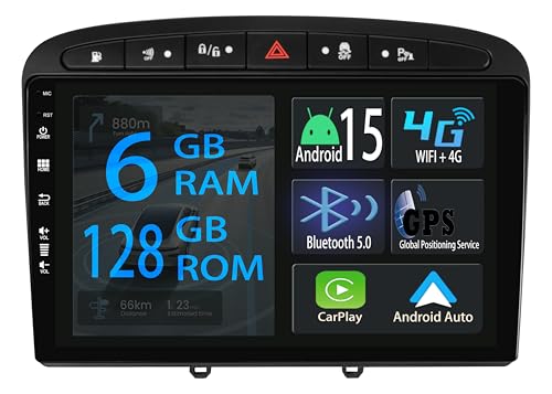 4+128 Go Autoradio pour Peugeot 308 408 2007–2015, Radio Android avec Écran Tactile, CarPlay & Android Auto sans Fil, GPS Wi‑FI Bluetooth, Mise à Niveau Plug & Play + Caméra de Recul