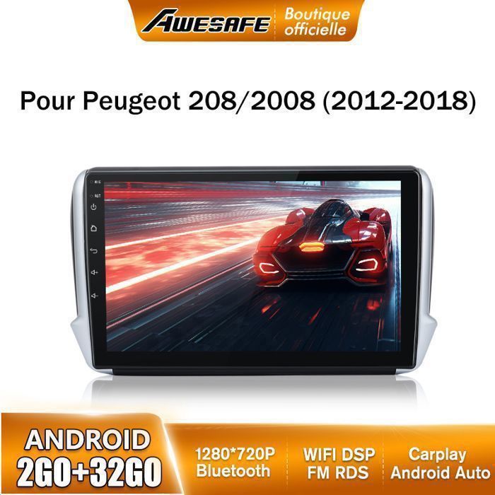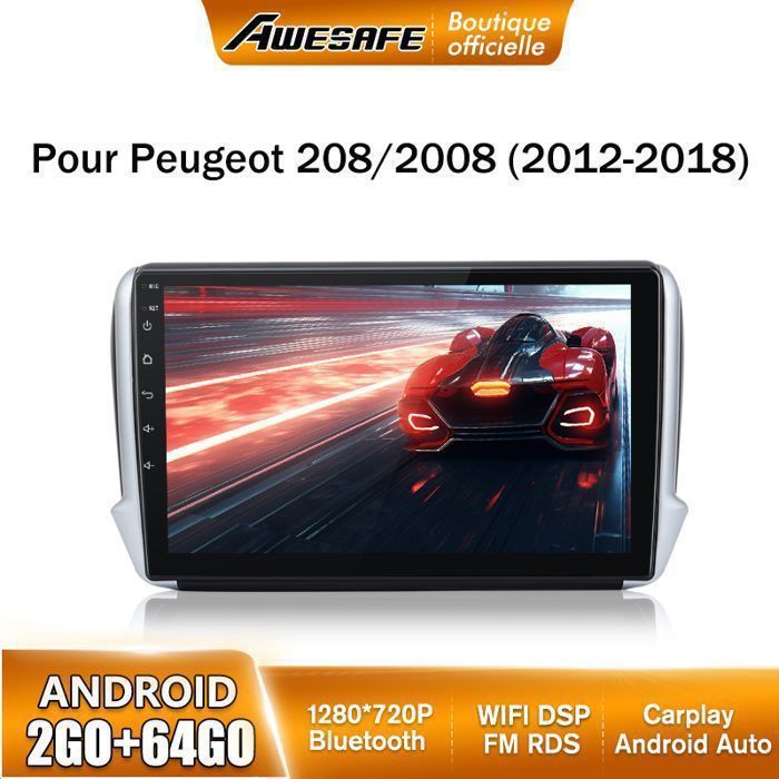 AWESAFE Autoradio pour Peugeot 208/2008 Android 13 avec Carplay 10 Pouces [2Go+32Go] Android Auto GPS/Wi-FI/Bluetooth/USB/FM/SD/RDS/Aide au Parking/Commande au Volant