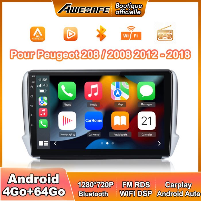 AWESAFE Autoradio Android 13 pour 208/2008 (4Go+64Go) 9 Écran Carplay Android Auto GPS Bluetooth WiFi FM RDS SWC