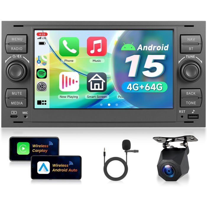 4G+64G Android 15 Autoradio 7 pour Ford Focus Fiesta C/S-Max Transit Mondeo CarPlay/Android Auto Sans Fil GPS WiFi Bluetooth Caméra