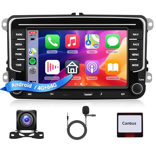 8 Core 4+64G Android Autoradio pour VW Golf 5 6 Polo Tiguan Passat Touran Caddy T5 Trasporter Skoda Seat Wireless Carplay&Android Auto, 7'' Écran Radio USB/Type-C/Bluetooth 5.0/Caméra de recul/FM/SWC