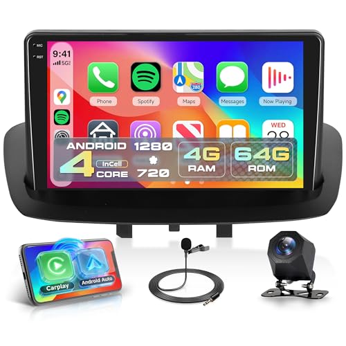 4G+128G Android Autoradio pour Renault Megane 3 Export 2009-2014 9'' Écran in-Cell Stereo Auto avec Carplay Android Auto sans Fil Mirror Link GPS Navi Bluetooth WiFi FM/RDS/EQ SWC Caméra Recul