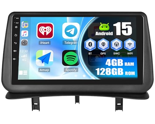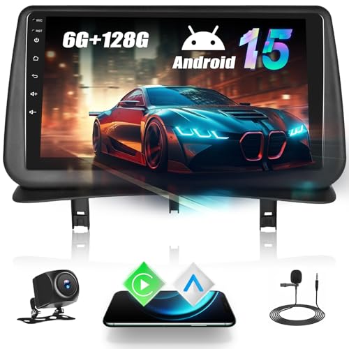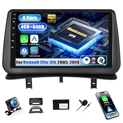 CAMECHO [Qualcomm 8-Core] Android 15 Autoradio pour Renault Clio 3 2006-2012, 4+64G Navi Wireless Carplay DSP, 9" Radio WiFi Sans Fil Android Auto FM/RDS Bluetooth 5.1 Mirror Link +Mic+Caméra de recul
