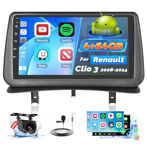 Roinvou 8 Cœurs 4G+64G Android Autoradio pour Renault Clio 3 2008-2014 sans Fil Carplay/Android Auto, 9'' Écran Tactile Radio FM/RDS 32EQ DSP WiFi Bluetooth GPS 59UI SWC Caméra de Recul