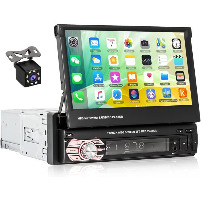 Autoradio bluetooth Carplay 1 Din GPS 7‘’ Écran Tactile Retractable FM Radio Main Libres AUX-USB-TF Lien Miroir+Télécommande+Caméra