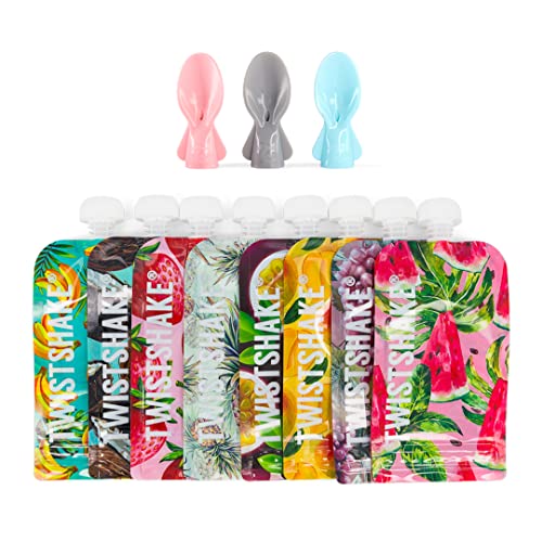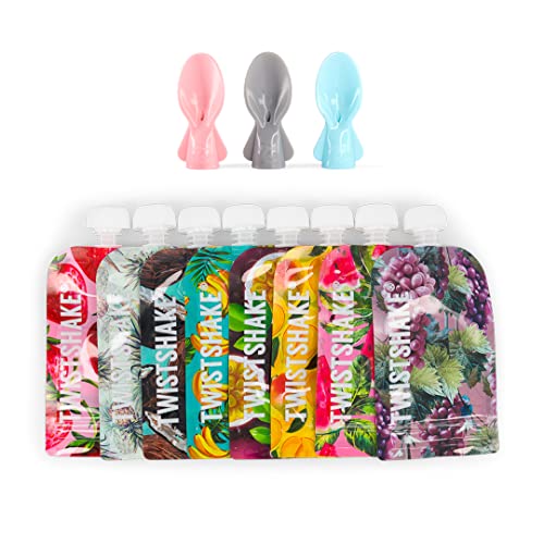 Baby Food Pouches 100ml + Spoon - Set of 8 | Reusable Double Zip Baby Food Bag | BPA Free Fill n Squeeze Baby Weaning Pouch | Leak-Proof Squeeze Pouch | Freezer Safe | Fruit Design