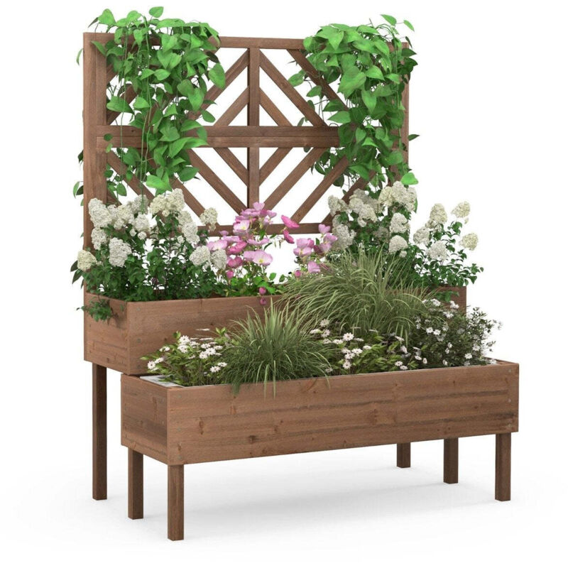 Northix - Jardiniere a 2 niveaux avec treillis jardiniere surelevee en bois avec pieds trou de drainage bac a plantes marron