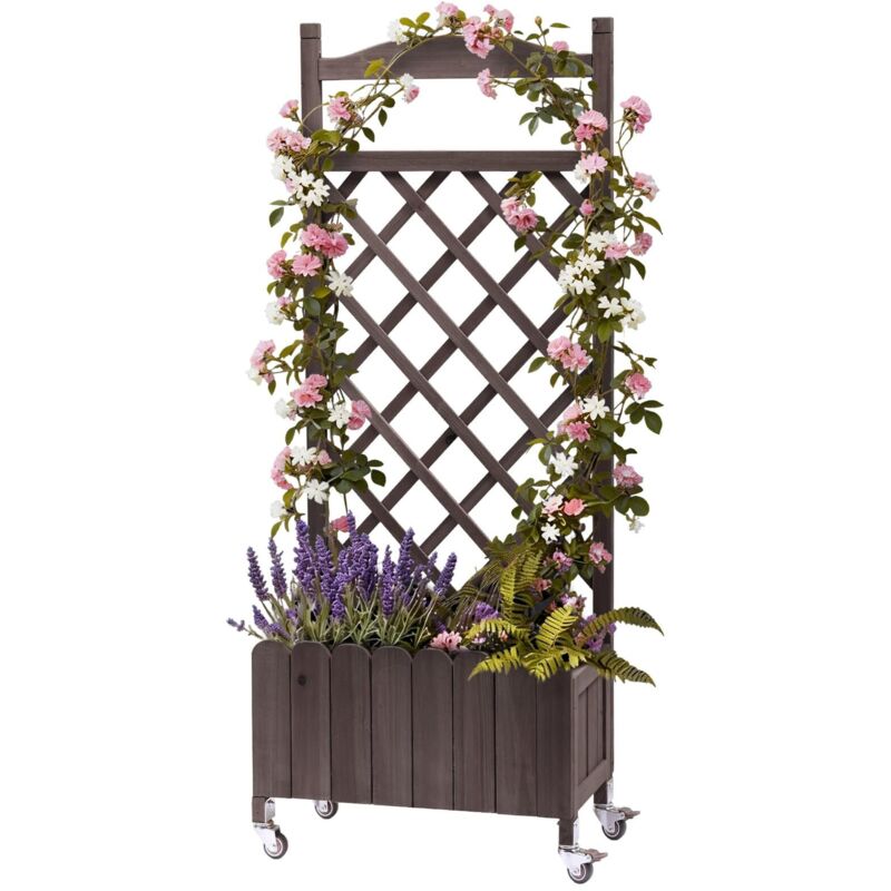 Jardinière à Treillis sur Roulettes, Bac Bois avec Trous Drainage, 49x28x116cm, Résistant Intempéries - Brun