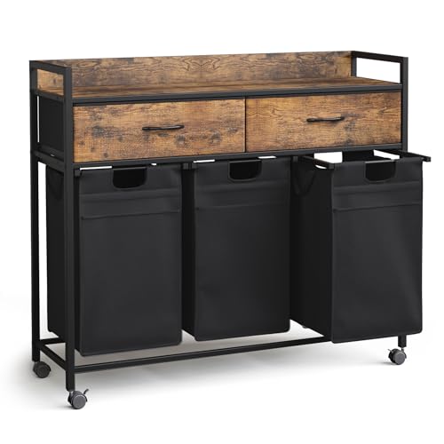 Mondeer Panier à Linge avec 2 Tiroirs, Chariot à Linge à 3 Compartiments, 3 x 50L Corbeille à Linge Amovibles, pour Buanderie Salle de Bain, 106 x 33 x 91,5 cm, Marron Rustique et Noir