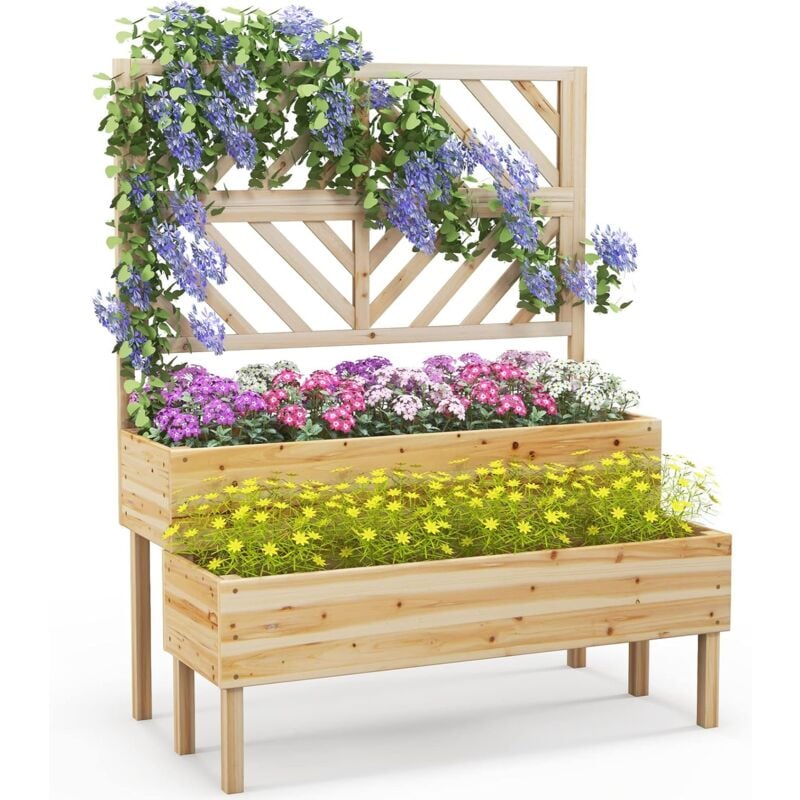 Relax4life - Jardinière avec Treillis à 2 Niveaux en Bois avec Trou de Drainage, Jardinière Surélevée pour Plantes Grimpantes, Bac à Fleurs pour