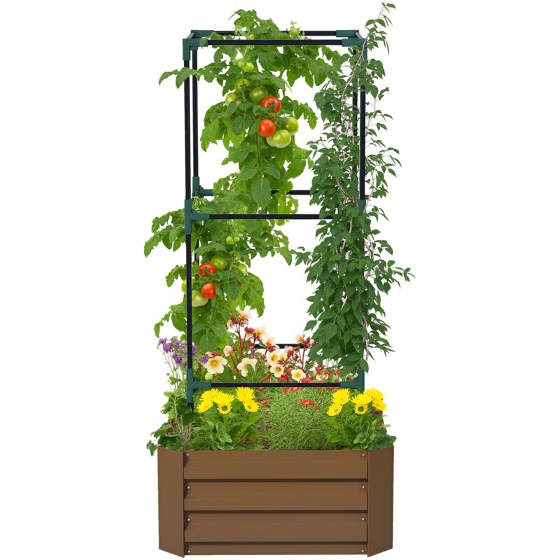 Jardinière surélevée avec treillis, bac à plantes grimpantes, fond ouvert, résistante aux intempéries, 61 cm x 61 cm x 140 cm, marron