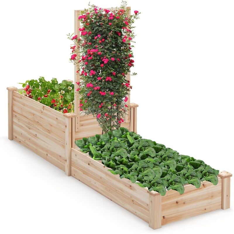 Costway - Jardinière Surélevée avec Treillis, Bac à Plantes avec Pieds, Doublure, Étagère et Trous de Drainage pour Plantes Grimpantes, Naturel