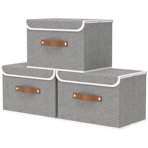 OUTBROS Paniers de Rangement, 45 x 30 x 30 cm Boîte Pliables avec Couvercles et Poignées, Bac Range pour Vêtement, Magazine, Chambre à Coucher (3 pièces, Gris)