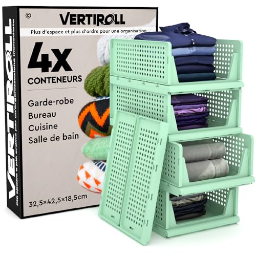 VertiRoll 4 Tiroirs Rangement Empilable Pliable Rangement Vetement Bac Peu Encombrant en Plastique Couleur Verte Maison Cuisine Bain Bureau Facile à Assembler - Tiroirs 32,5x42,5x18,5cm