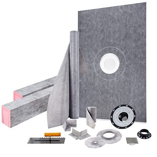 VEVOR Kit receveur de douche 965x1524 mm seuil de douche étanche avec drain décalée PVC, grille acier inoxydable 10 cm, 2 bordures de douche et truelle découpables, bac de douche pour salle de bain