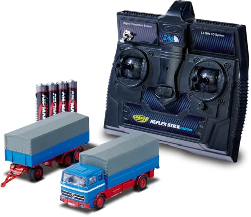 Carson Bâche 1:87 Mo 1620 avec remorque, 100% RTR Bleu - Modèle prêt à Conduire, Voiture RC, Voiture H0, Modèle RC, Véhicule Diorama, Camion Télécommandé, Camion Télécommandé