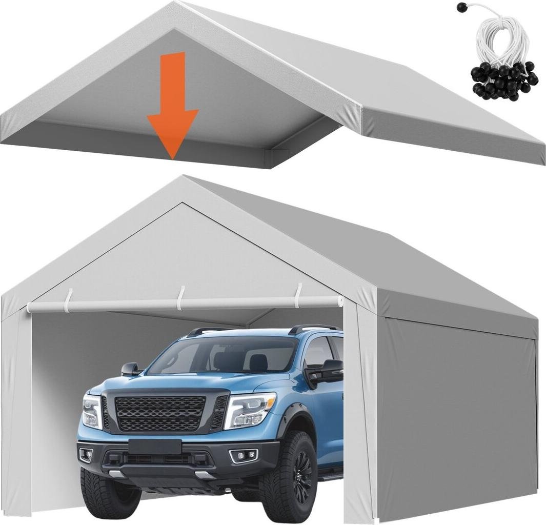 Auvent de remplacement pour abri de voiture, bâche pour garage portable de 3,6 x 6 m avec parois latérales, résistante aux UV et imperméable, bâche pour abri de voiture robuste avec attaches à boules, grise, cadre non inclus