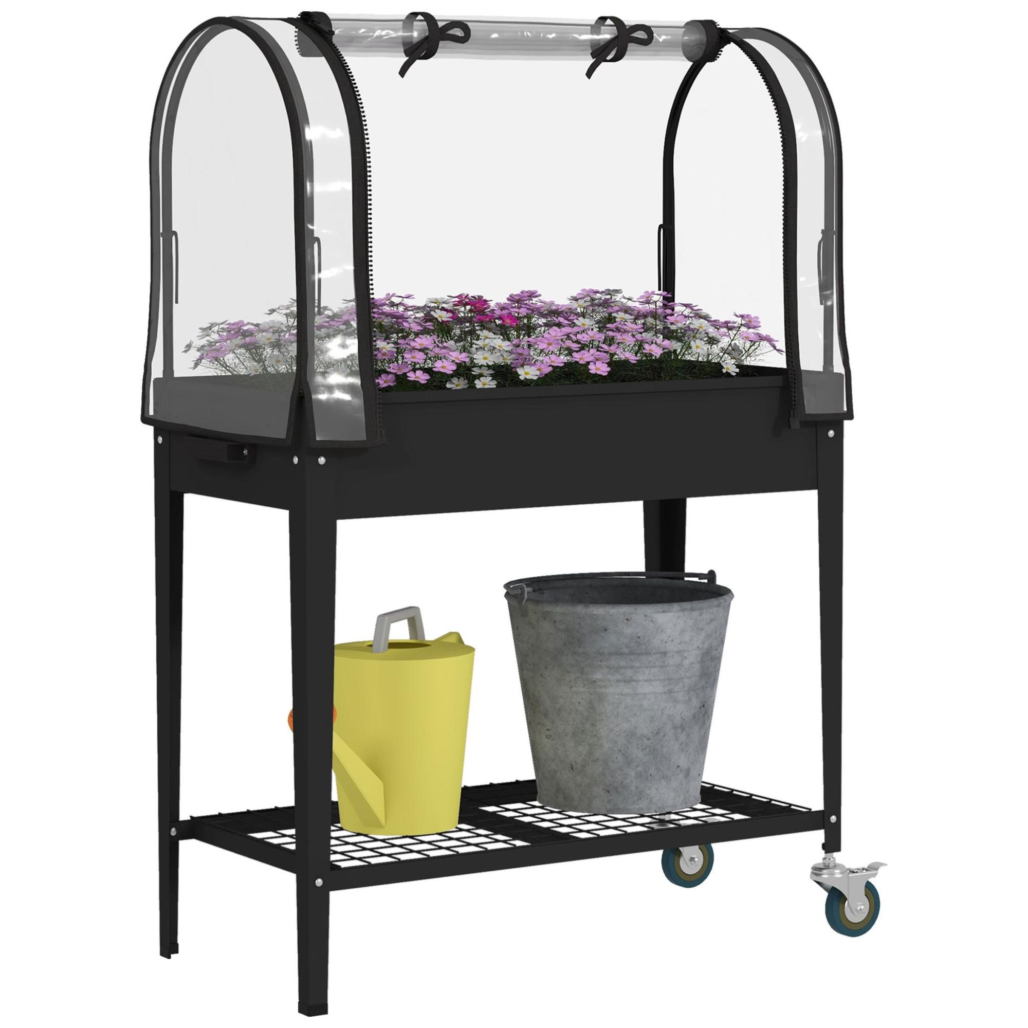 Outsunny Jardinière surélevée Potager avec bâche Transparente, Mini Serre de Jardin, 2 roulettes et 1 étagère inférieure pour légumes, Fleurs, Potager, dim. 80L x 40l x 120H cm, Noir