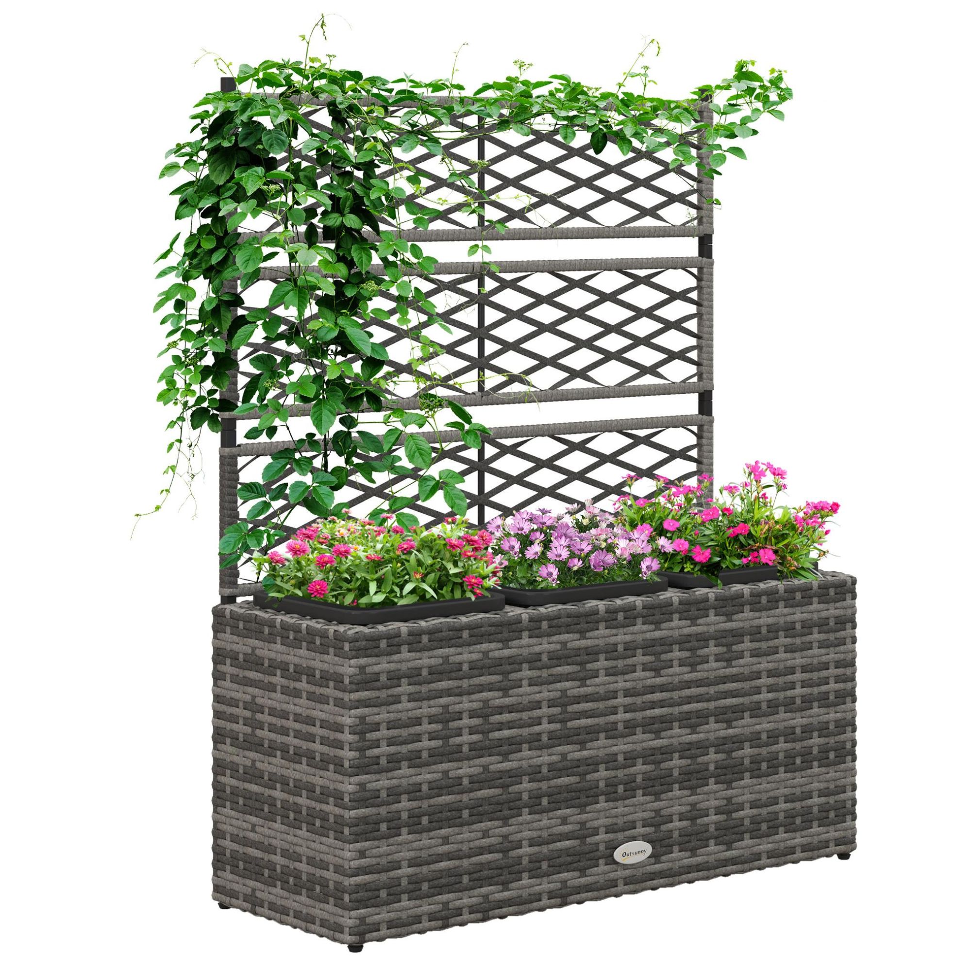 Outsunny Jardinière pour plantes avec treillis 3 bacs à plante 33L en résine tressée et acier dim. 84L x 30L x 107H cm
