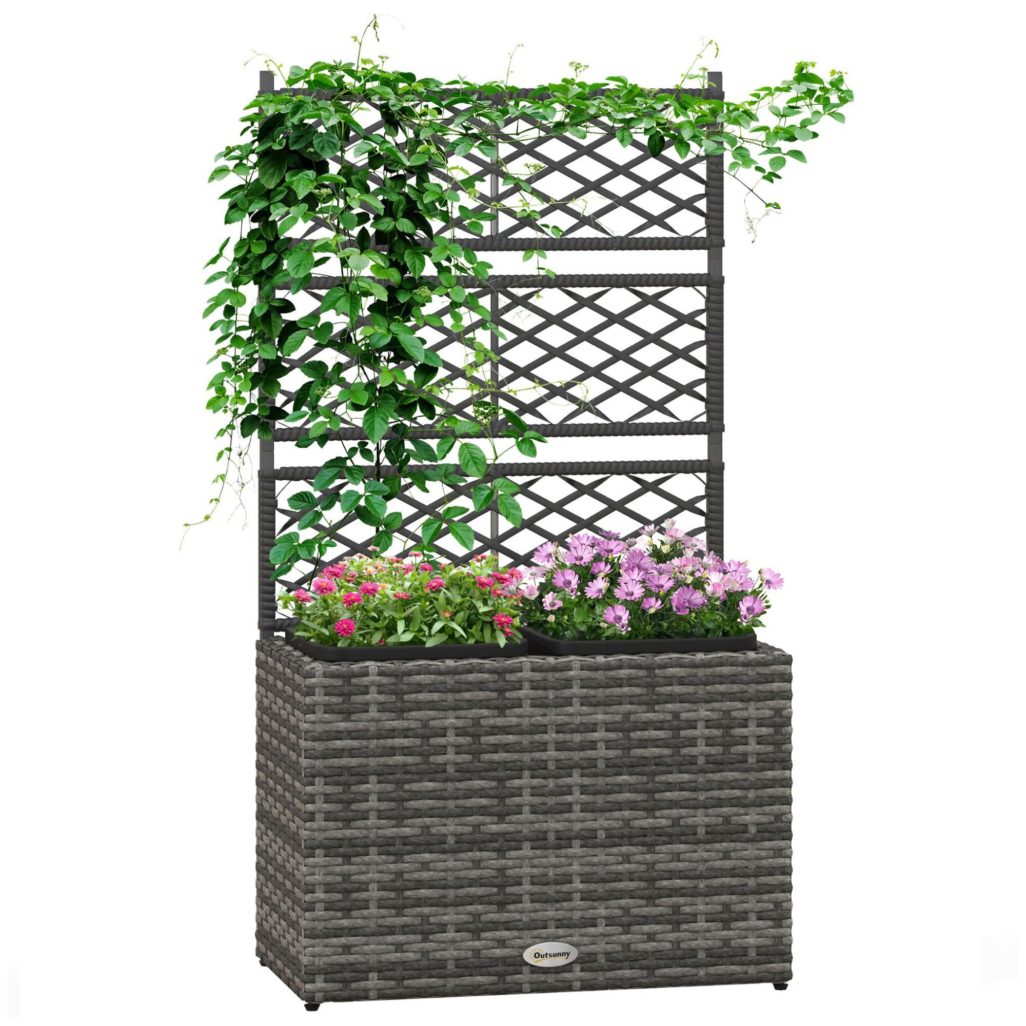 Outsunny Pot de Fleurs de Jardin en rotin synthétique avec Treillis, lit de Fleurs surélevé sur Pied avec Deux bacs à Plantes pour Jardin, Plantes grimpantes, 57 cm x 30 cm x 107 cm, Gris mélangé