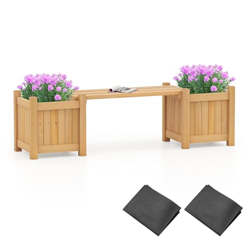 GOPLUS Bac à Plantes en Bois avec Banc Jardin, 2 Bacs Surélevés pour Jardin Extérieur avec Base Ouverte et Finition Huile Teck, Pots de Fleurs, Jardinière Balcon(Naturel,105x26,5x29,5CM|Banc)