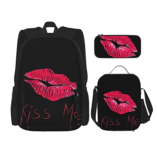IUBBKI Ensembles de sac à dos scolaire 3 pièces Teens Studentss (rose pink lip print kiss me) Book Bag + Lunch Bag + Trousse à crayons Cute Sackpack College Work Gym Randonnée Pêche Sac d'ordinateur