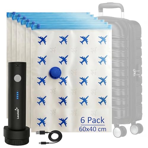 Lavatelli Set de Voyage pour Bagage à Main avec Pompe sans fil USB-C & 6 sacs sous vide 40x60 cm, Kit gain de place pour trolley 55x40x20, vêtements et linge