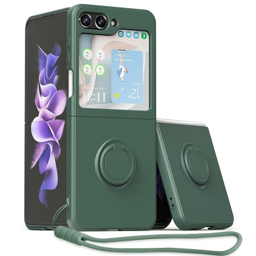 UEEBAI Silicone Coque avec Ring pour Samsung Galaxy Z Flip 5 5G, Etui Fin Pliable et léger Absorption des Chocs Housse Mince avec Hand Strap Bague 360 Degrés Rotation Stand Cover, Armée Verte