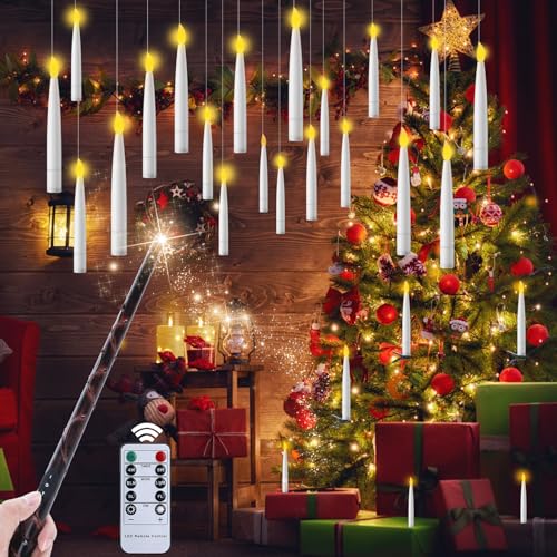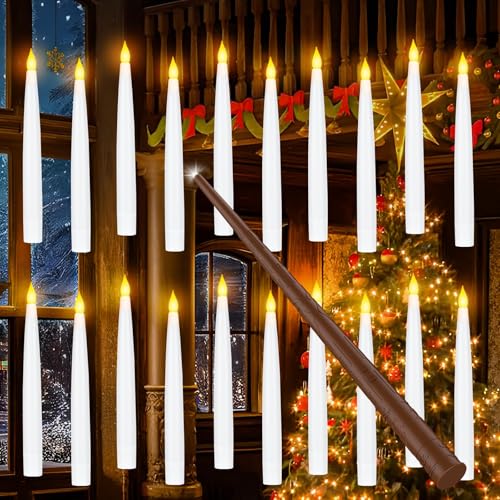 Tyreses Lot de 20 Bougies Flottantes Magiques Suspendues avec Baguette, Noël Bougies électrique Flamme Lumière Chaude Vacillante Bougie Conique LED à Piles Pour Décoration de Noël, Mariage