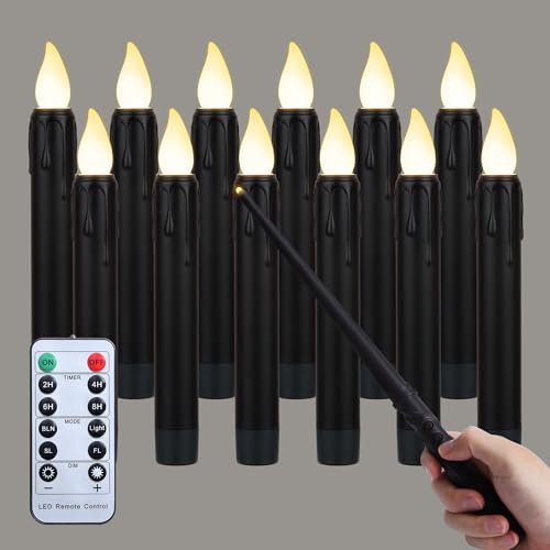 Lot de 12 bougies LED sans flamme avec baguette magique et télécommande - Fonction minuterie - Bougies LED sans flamme suspendues - Pour décoration d'Halloween, de fête de Noël