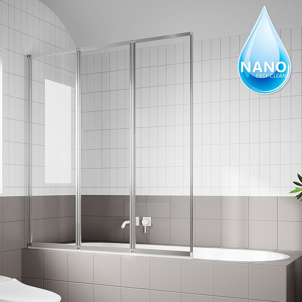 Aica Sanitaire Pare-baignoire 130cm Hauteur 140cm, pivotant et pliant, 3 volets, écran de douche en verre anticalcaire