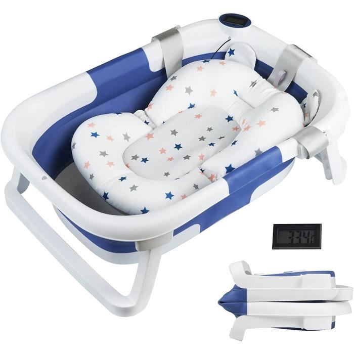Baignoire Bebe Pliable - Avec Thermometre & Tapis de Bain - Pieds Antiderapants - Bleu