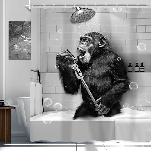 Newsely Rideau de Douche Singe Amusant 183 x 183 cm - Noir et Blanc - Chimpanzé Chantant dans la Baignoire - pour Hommes, Enfants, garçons, Salle de Bain - Moderne - Imperméable - Accessoires de