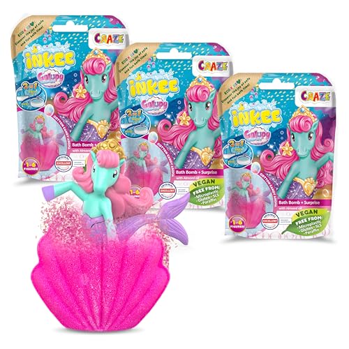 CRAZE INKEE 3 Set Boule de Bain Surprise Licorne Beach Bombe de Bain arôme Pop-Corn avec Surprise à l'intérieur Jouet Bain Bébé 1x Figurine Licorne Bain moussant Enfant, 38741