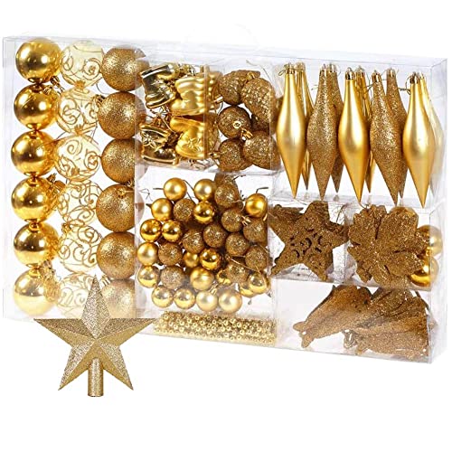 BAKAJI Lot de 102 Boules de Noël pour Sapin de Noël, étoiles, Pommes de pin, dorées, Taille Standard