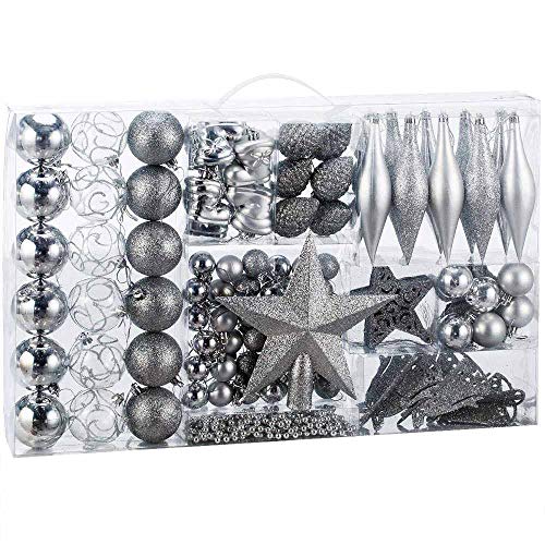 BAKAJI Lot de 102 Boules de décoration pour Sapin de Noël - Chaussettes - Étoiles de pin - Décorations de Noël (argenté)