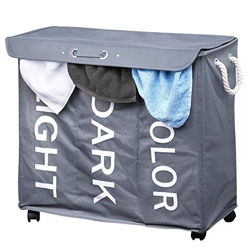 Bakaji Panier à linge sale à 3 compartiments à linge 3 espaces en tissu Oxford pliable avec roues et poignées, dimensions 63 x 35 x 57 cm (gris)