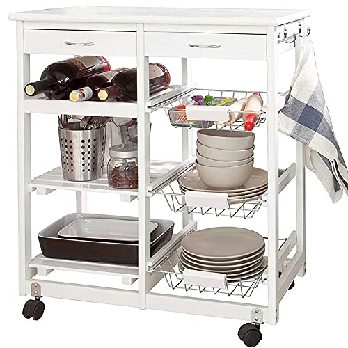 BAKAJI Chariot de Cuisine en Bois, Chariot économe en Espace, 3 Compartiments, 3 paniers, Structure avec Roues, Dimensions 67 x 37 x 75 cm, Couleur Blanche