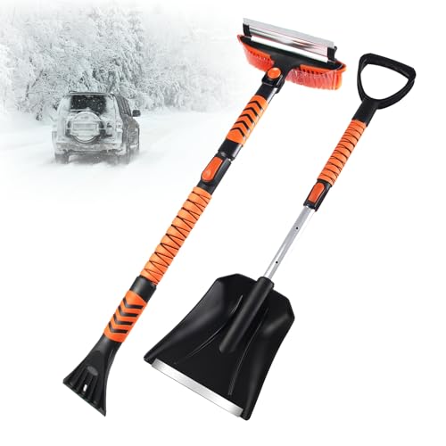 Duroecsain Grattoir à glace, brosse à neige - Kit de grattoir à neige pour voiture, balai à neige pliable portable avec manche ergonomique rétractable, pelle en métal résistant de grande capacité